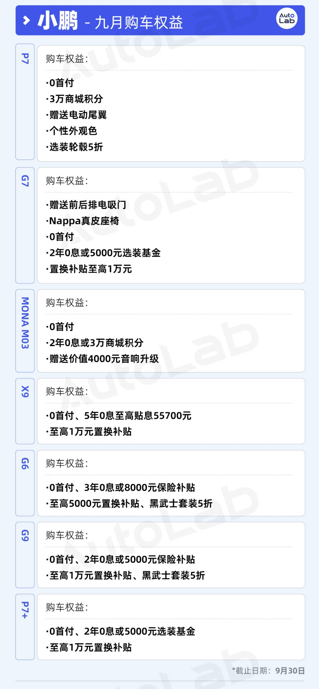 在本月,小鹏对自家主销的MONA M03、P7+、G7等车型的权益进行了加码,新增了“N年0息”、保险补贴等政策。